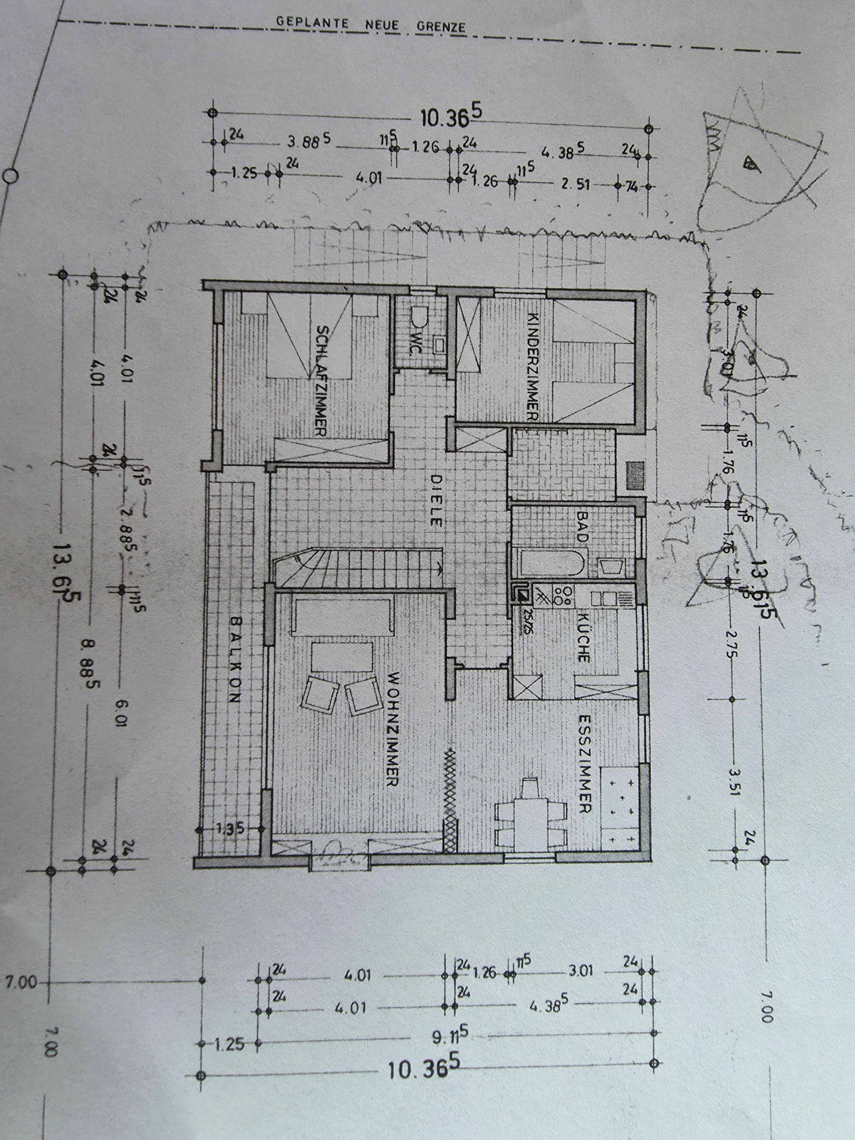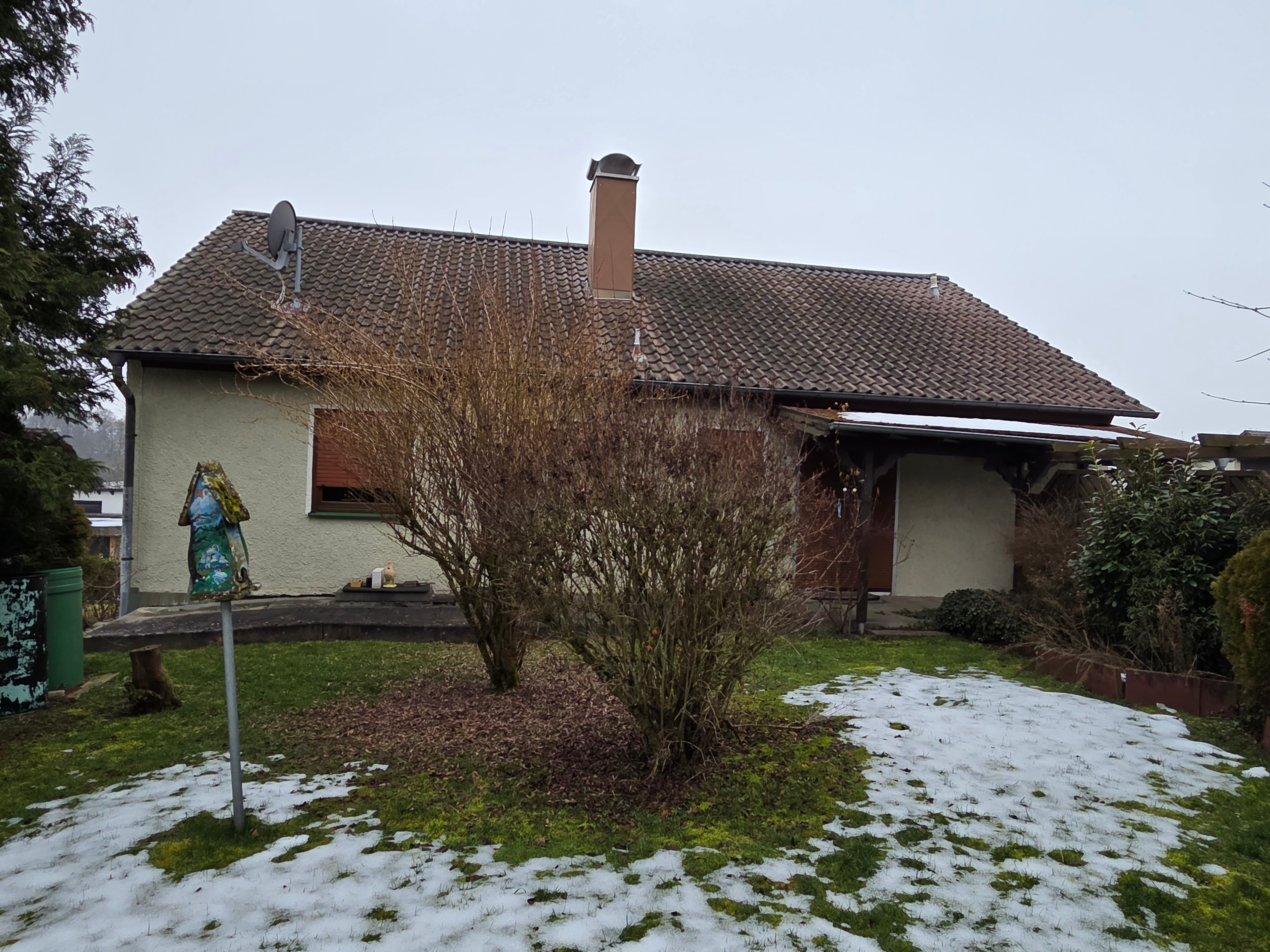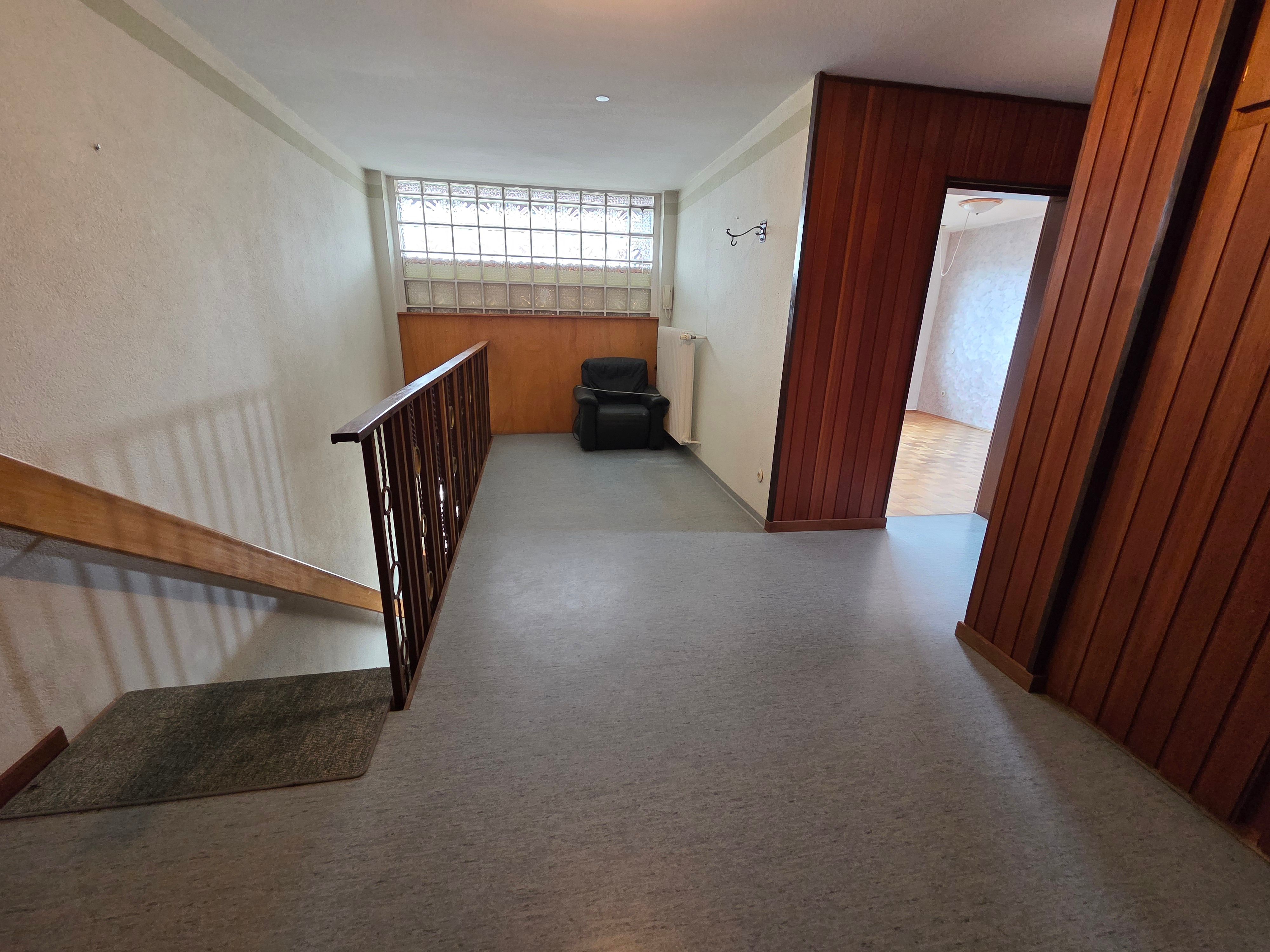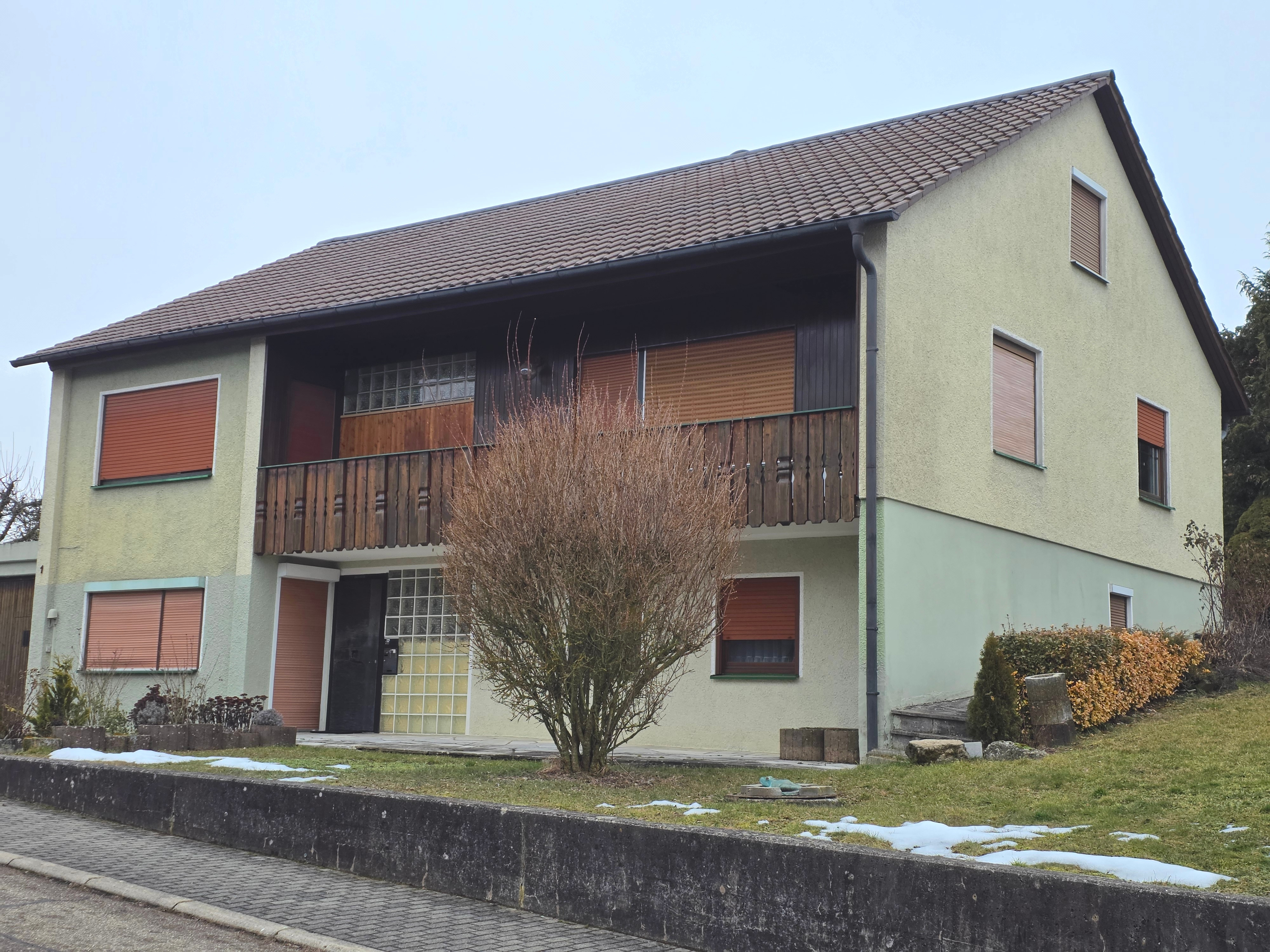 Das Wohnhaus wurde im Jahr 1969 auf einem 665m² großen Grundstück in Massivbauweise errichtet. Der Eingangsbereich befindet sich an der Süd-Westseite und ist größzügig gestaltet. Über eine Treppe gelangt man ins Obergeschoß. Von der Diele können alle Räume begangen werden. Über das helle und offene Esszimmer wird das lichtdurchflutete Wohnzimmer begangen. Vom Wohnzimmer aus gibt es einen Zugang zum Balkon, der nach Süd-Westen ausgerichtet ist. Direkt von der Diele gelangt man auch in die Küche, welche dem Esszimmer vorgelagert ist. Von der Küche gibt es eine Durchreiche ins Esszimmer. Ebenfalls wird über die Diele das Bad und der Ausgang zur Terrasse erreicht. Über den Flur errreicht man ein weiteres Schlafzimmer, ein Kinderzimmer und eine Toilette . Vom Schlafzimmer aus gibt es einen weiteren Zugang zum Balkon.