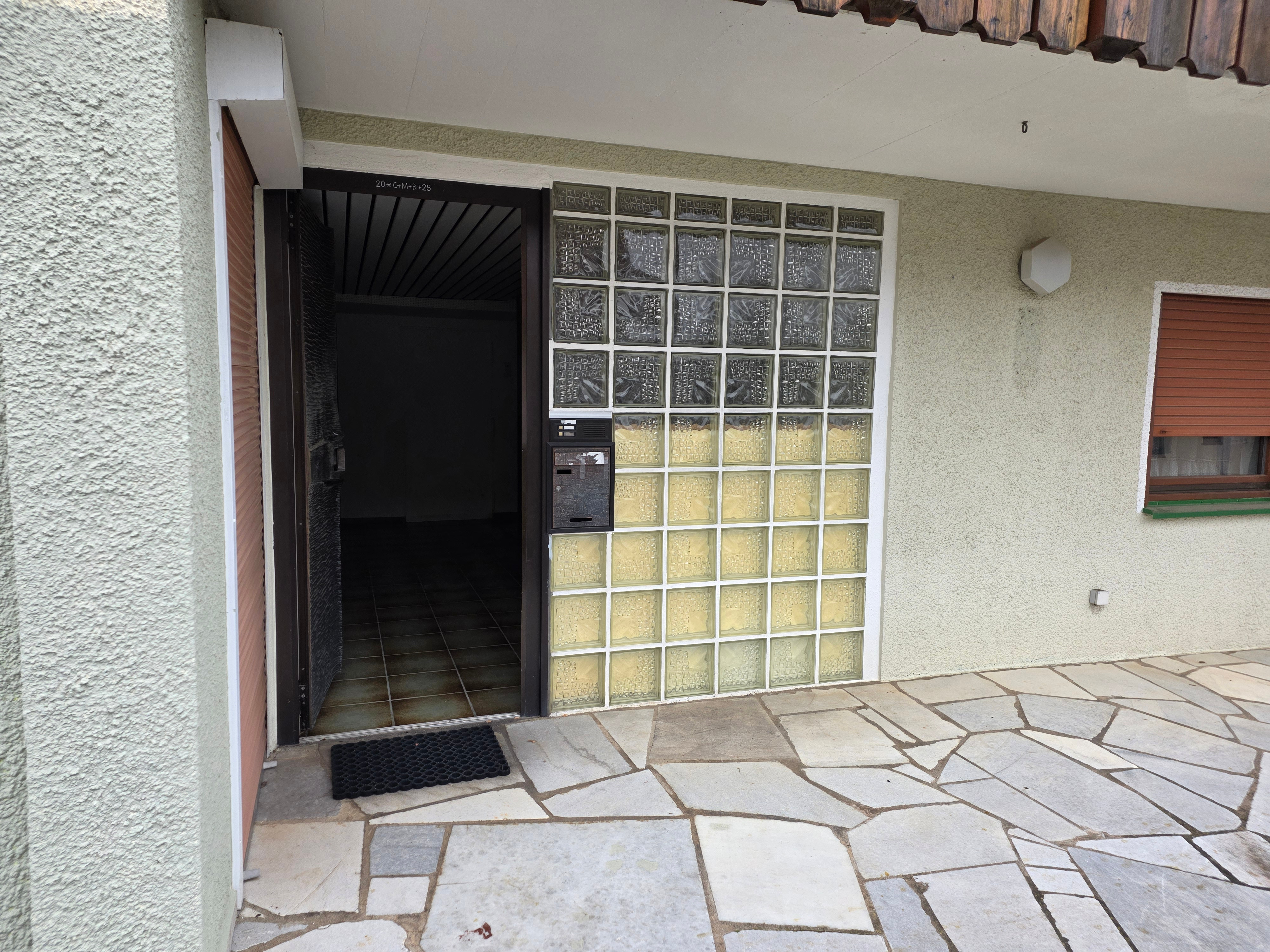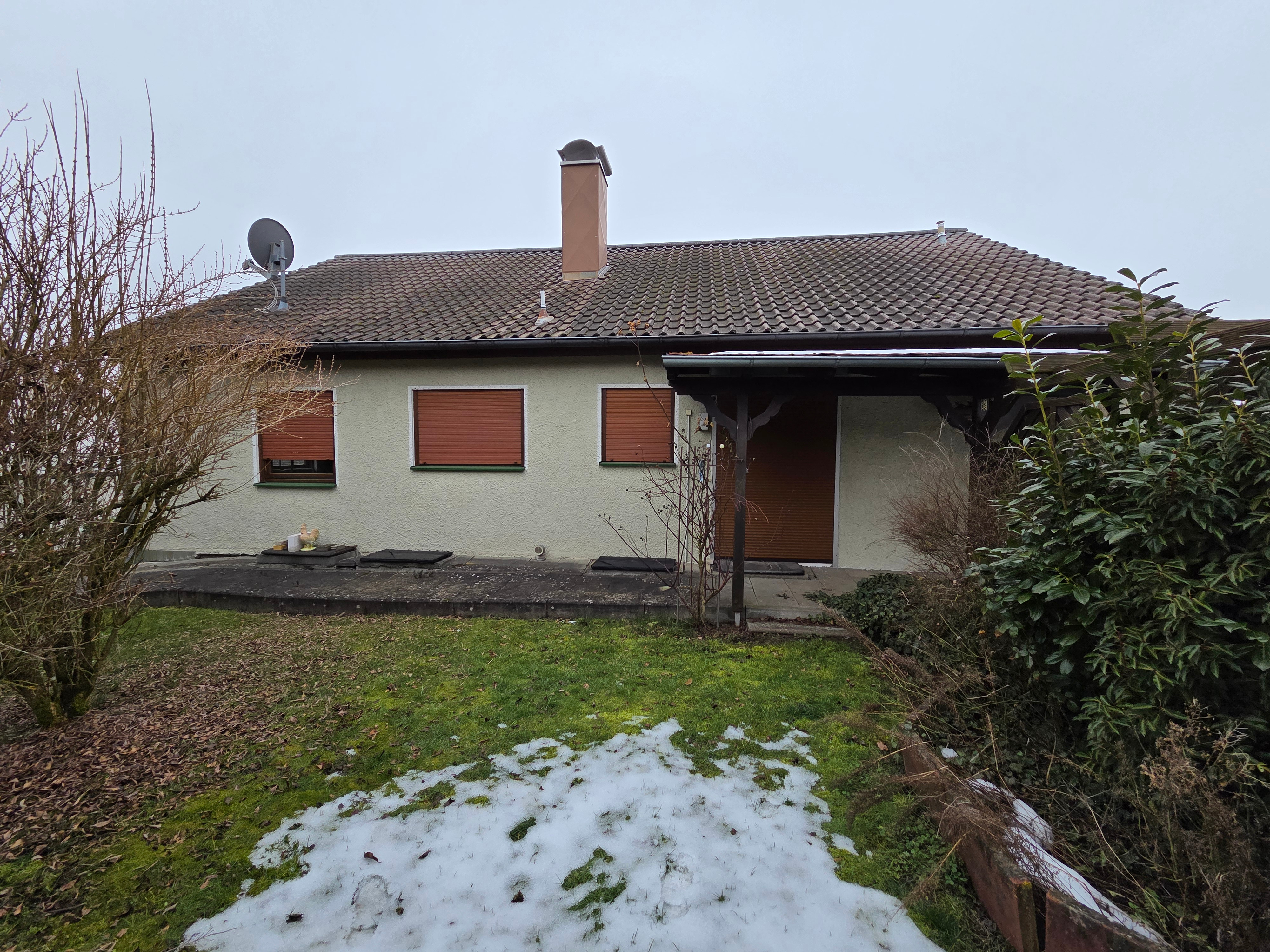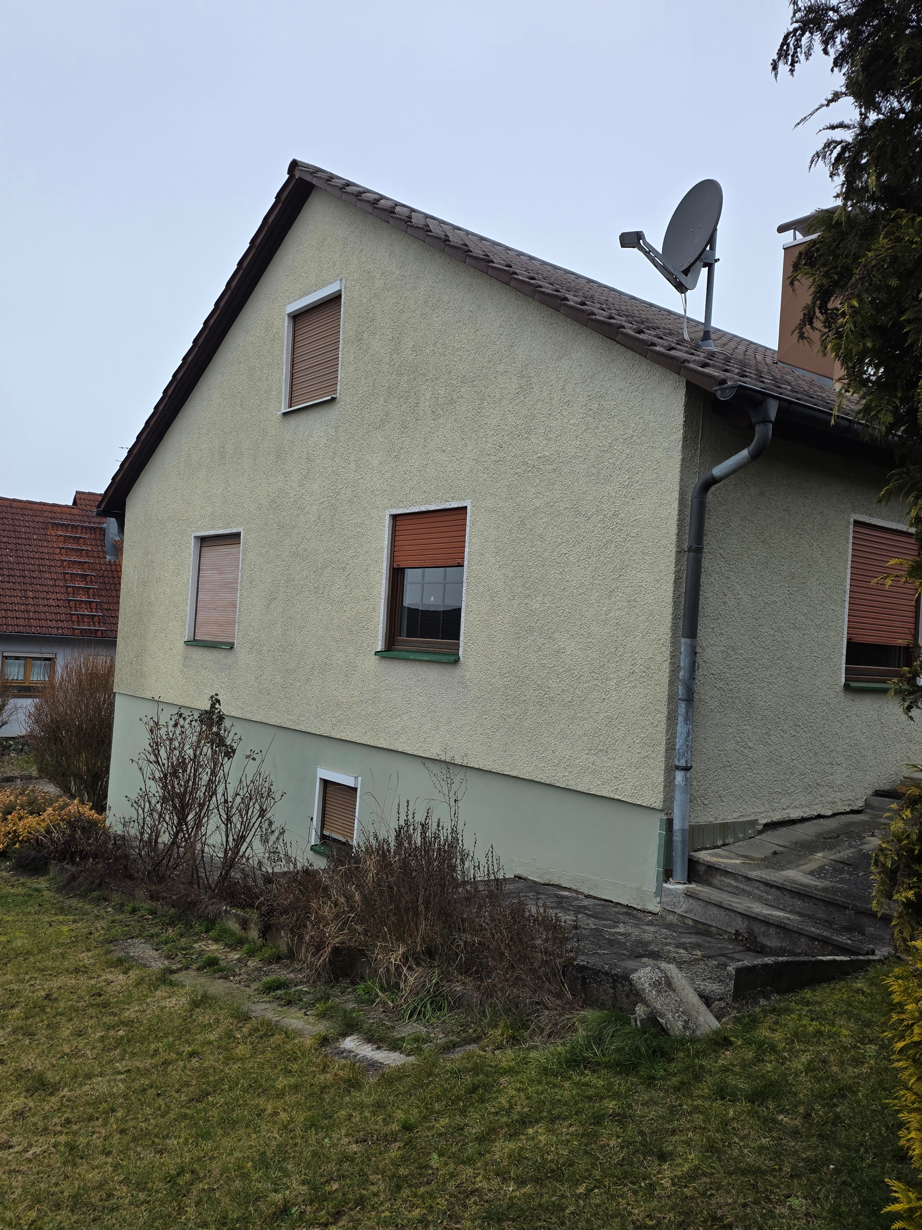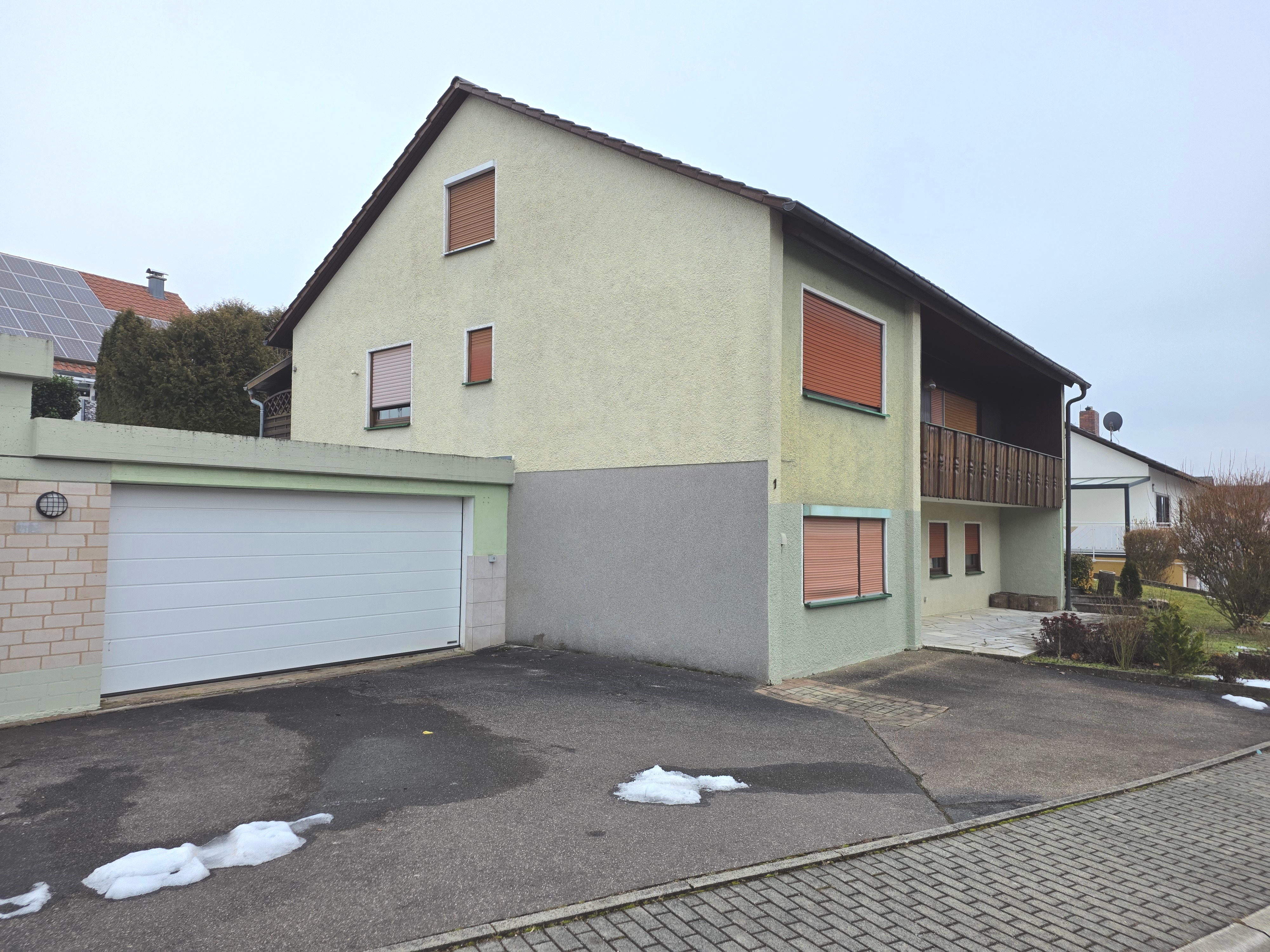 Das Wohnhaus wurde im Jahr 1969 auf einem 665m² großen Grundstück in Massivbauweise errichtet. Der Eingangsbereich befindet sich an der Süd-Westseite und ist größzügig gestaltet. Über eine Treppe gelangt man ins Obergeschoß. Von der Diele können alle Räume begangen werden. Über das helle und offene Esszimmer wird das lichtdurchflutete Wohnzimmer begangen. Vom Wohnzimmer aus gibt es einen Zugang zum Balkon, der nach Süd-Westen ausgerichtet ist. Direkt von der Diele gelangt man auch in die Küche, welche dem Esszimmer vorgelagert ist. Von der Küche gibt es eine Durchreiche ins Esszimmer. Ebenfalls wird über die Diele das Bad und der Ausgang zur Terrasse erreicht. Über den Flur errreicht man ein weiteres Schlafzimmer, ein Kinderzimmer und eine Toilette . Vom Schlafzimmer aus gibt es einen weiteren Zugang zum Balkon.