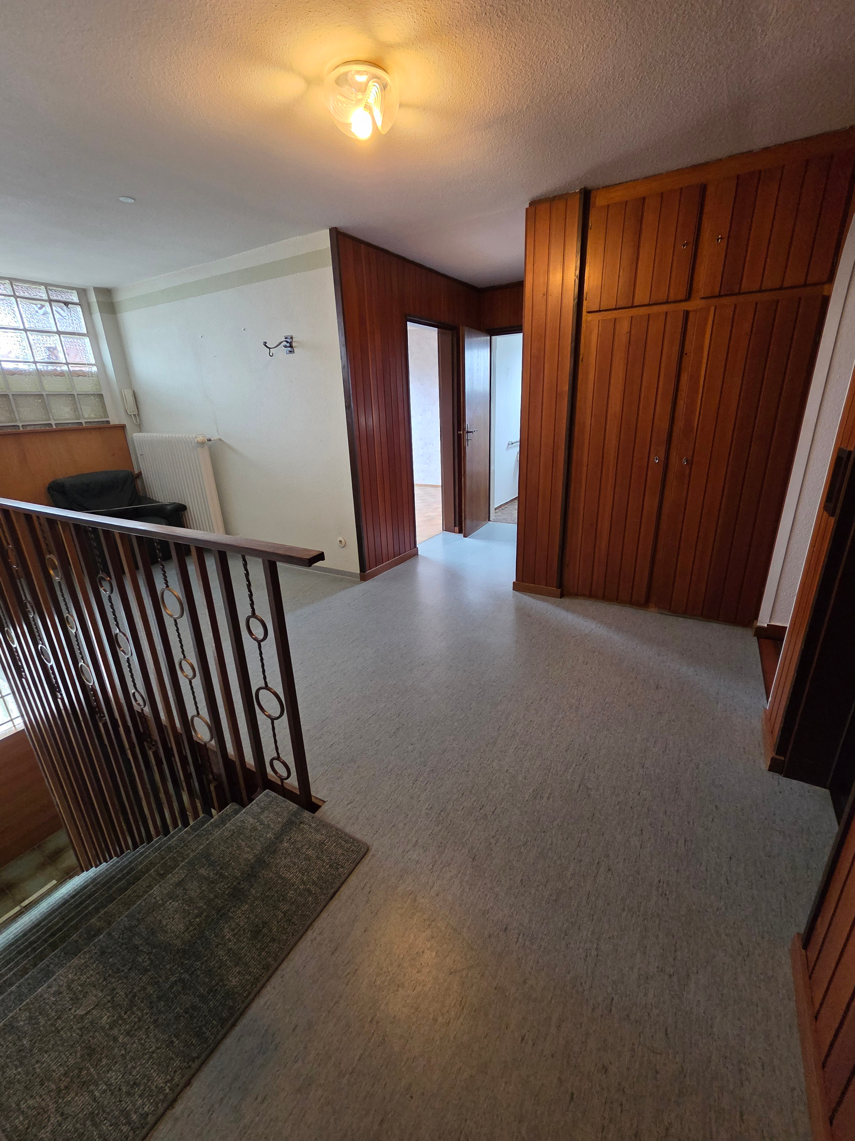 Die Ausstattung ist dem Baujahr entsprechend. Die meisten Elektroinstallationen und Sanitärinstallationen sind aus dem Baujahr. Sämtliche Fenster sind isolierverlgast und die meisten stammen aus dem Baujahr. Rollläden sind an allen Fenstern angebracht. Heizkörper wurden zum Teil erneuert. Die Ölzentralheizung stammt aus dem Jahr 2000 und ist voll funktionstüchtig. Das gesamte Haus wird mit einer Ölzentralheizung beheizt und auch das Brauchwasser über diese bereit gestellt. Als Öllager sind drei Batterietanks mit jeweils ca. 2000 l Fassungsvermögen vorhanden. Als Bodenbelag sind teils Parkett, teils Linoleum, teils Fliesen und teils Teppich verlegt. Der Balkon ist gefließt.